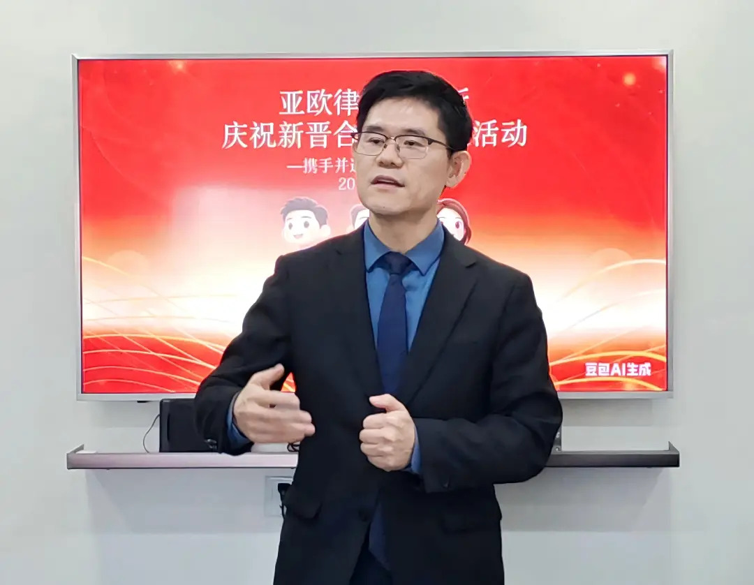 2026 年 1 月 17 日,亚欧中国总部(北京所)举办新增合伙人庆祝活动,全体驻所律师齐聚一堂,共享喜悦、共话发展。活动现场氛围热烈,两位新晋合伙人先后发言,他们均表达了对律所平台、团队支持及客户信任的深切感激,并分享了执业以来的感悟与成长。