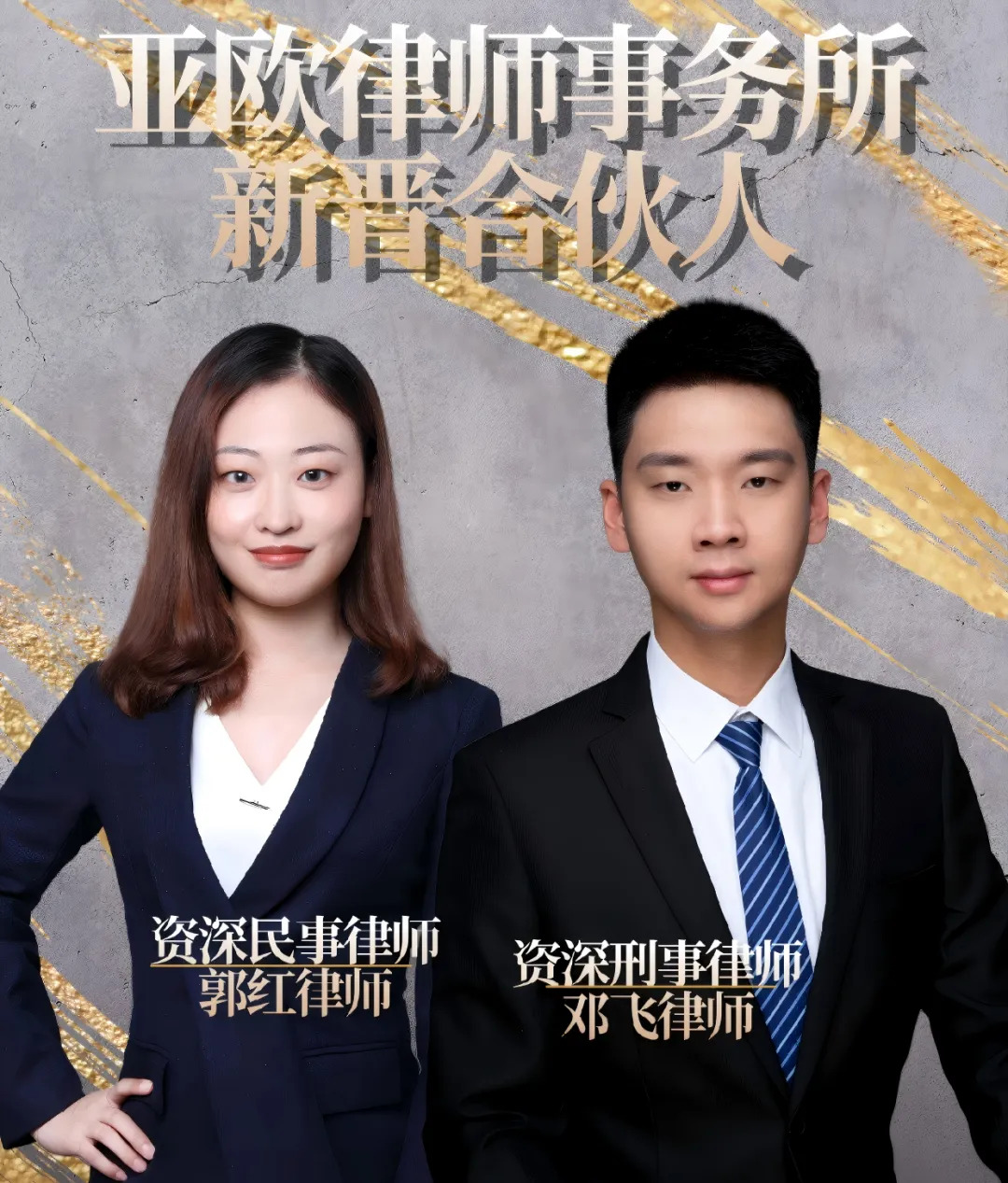 作为资深律师,邓飞律师专注刑事辩护与合规领域,凭借严谨的逻辑思维与丰富的庭审经验,成功办理多起复杂疑难案件,为当事人权益保驾护航;郭红律师则在民商事争议解决、企业法律顾问等领域造诣深厚,以专业高效的法律服务赢得客户广泛赞誉。两位律师的晋升,彰显了亚欧律所 “以专业立所、以人才兴所” 的发展理念。